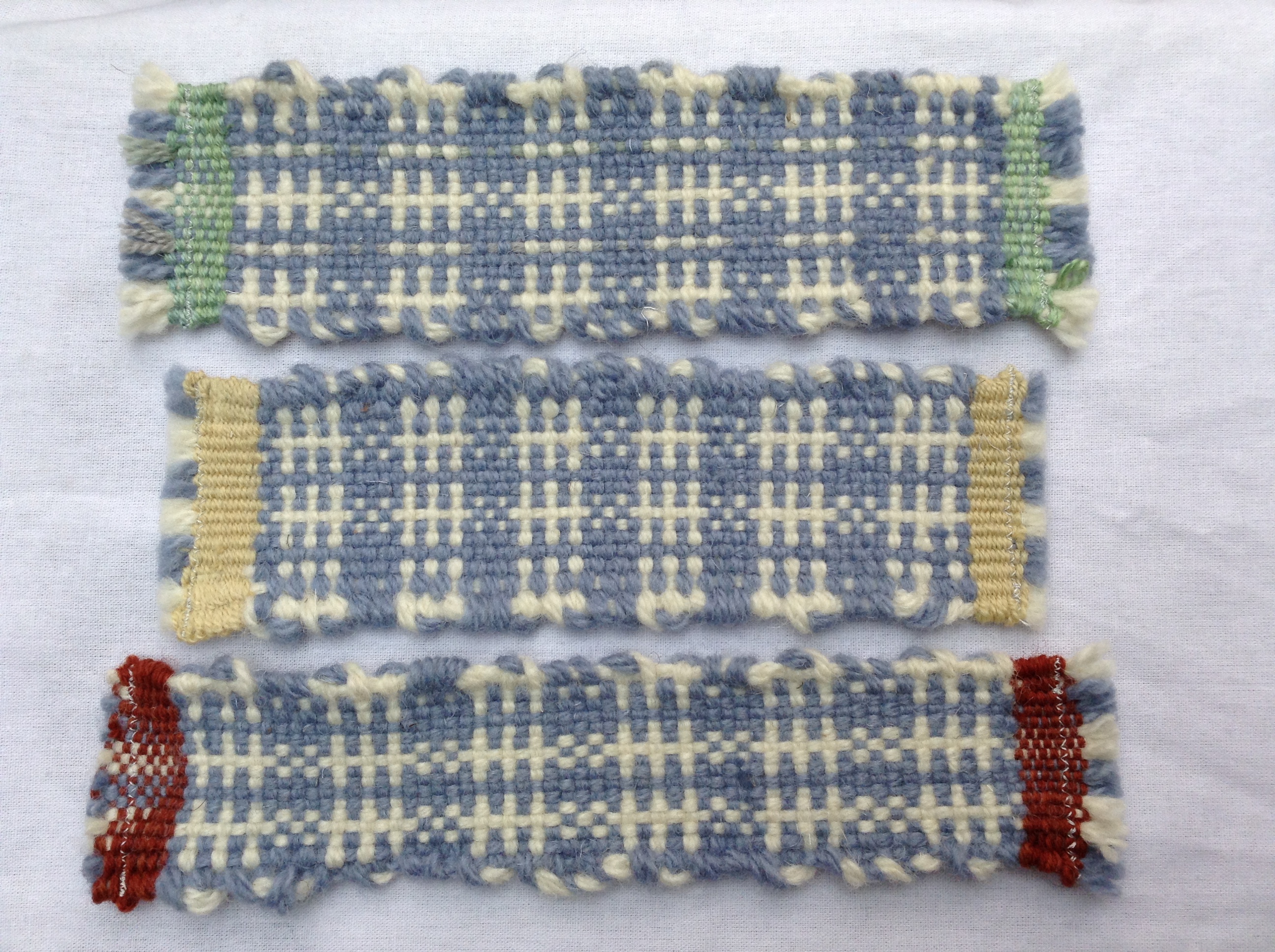 I received my yarn on cones, wound it onto hanks and sent it off to Triskelion to be dyed. I kept back a tiny amount, dyed half with some odd blue dye and did this sampling. I made adjustments to the pattern and tried different setts to produce a good upholstery cloth weight.