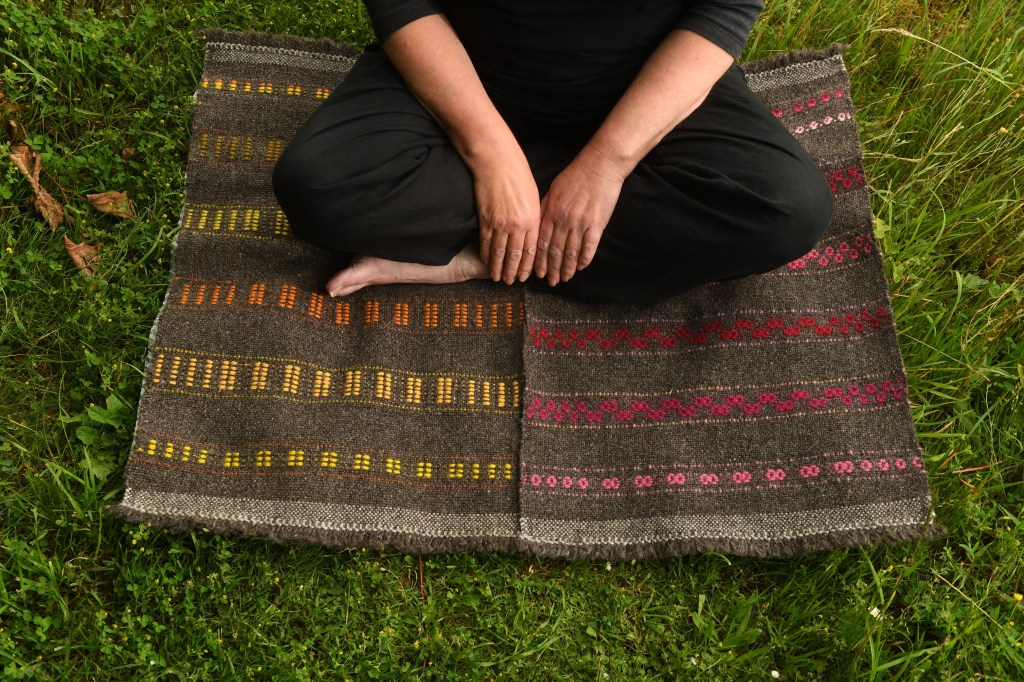 My studio is situated in the countryside a few miles from Cirencester, so lots of outside shots were taken too; this image is showing the Yoga Meditation rugs I have been weaving during the past year. During lockdown I had no income from teaching so these were created to generate an income. They were (and still are) available to purchase or to commission a bespoke pattern/colourway.